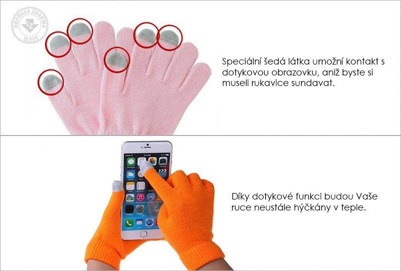 Speciální šedá látka na palcích, ukazováčcích a prostředníčcích obsahuje tepelně vodivá vlákna, která umožňují kontakt s dotykovou obrazovku, aniž byste si museli rukavice sundavat.