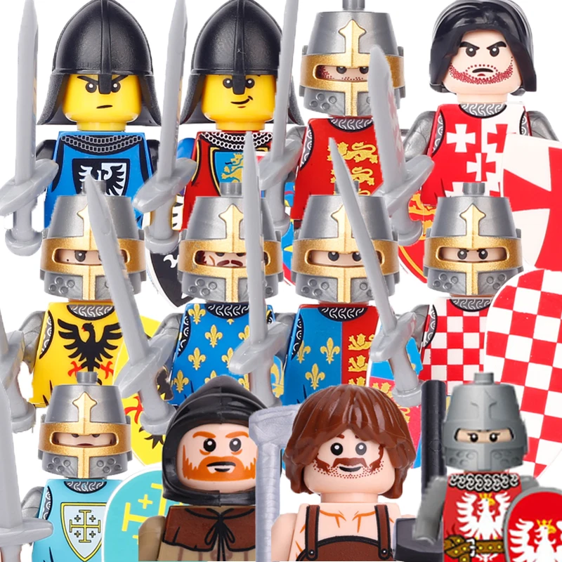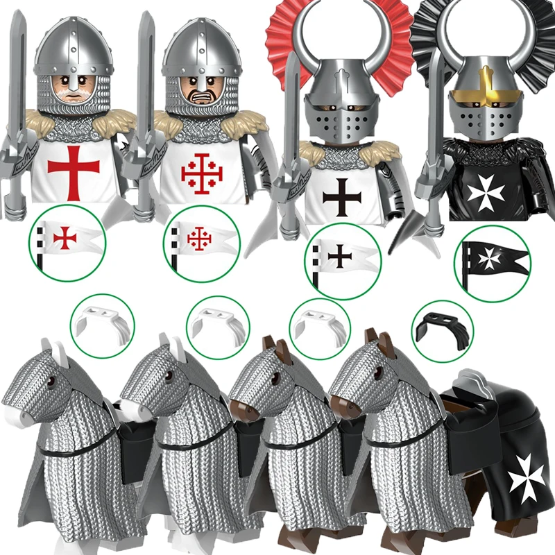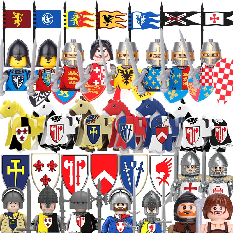Sada obsahuje figurky rytířů, válečného koně, středověké štíty a vlajky, a další příslušenství pro rekonstrukci historických bitev.