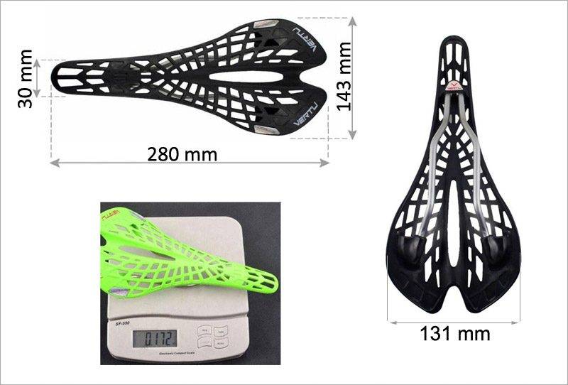 VERTU váží pouhých 172 g oproti běžnému sedlu, které často váží až 3x více. Díky nízké hmotnosti je sedlo ideálním pomocníkem při jízdě nejen do kopce, jelikož zkušenější cyklista ví, že každý gram se počítá. Rozměrově sedlo vyhovuje spíše mužům, protože šířka sedla je 143 mm a délka 28 mm (ženy díky širší pánvi většinou potřebují šířku 155 mm).