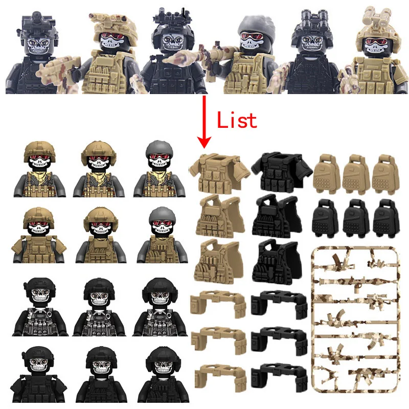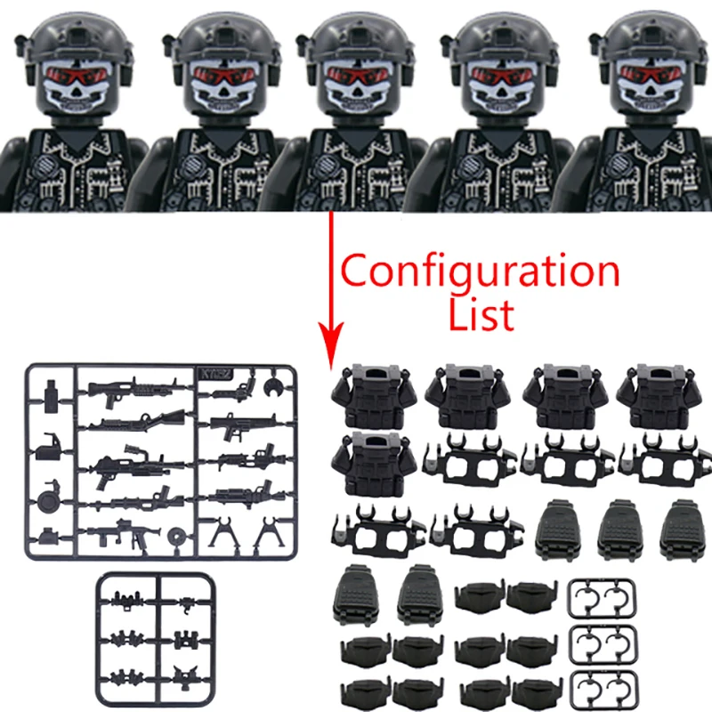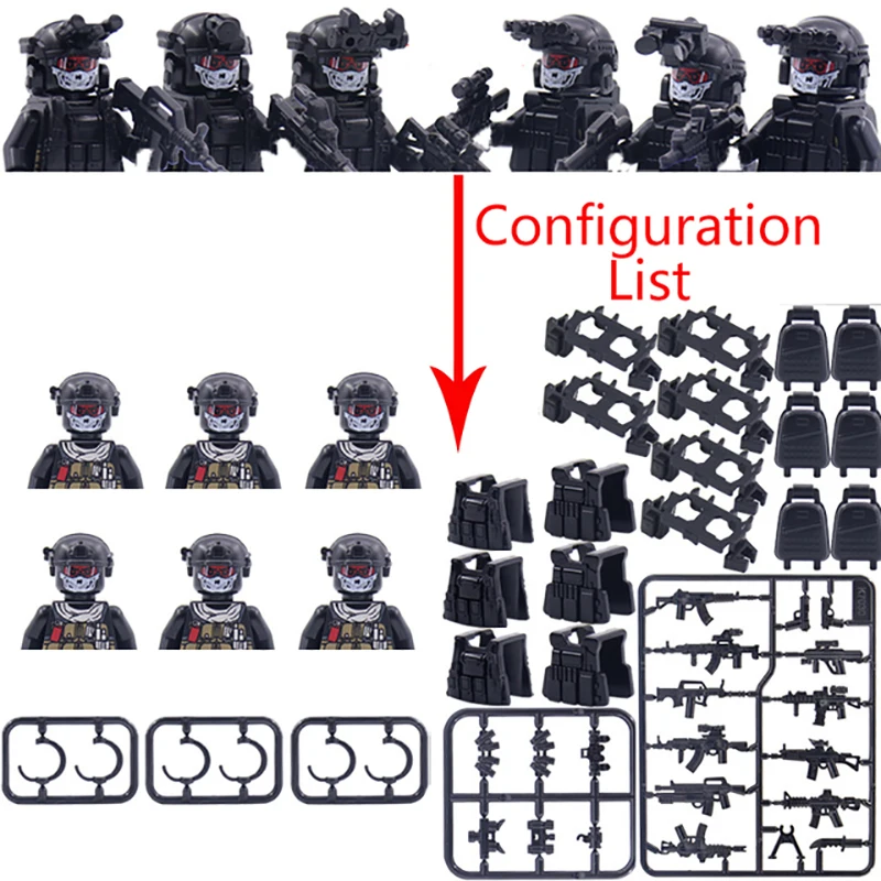 Stavebnice obsahuje figurky, bloky, noční vidění a další příslušenství.